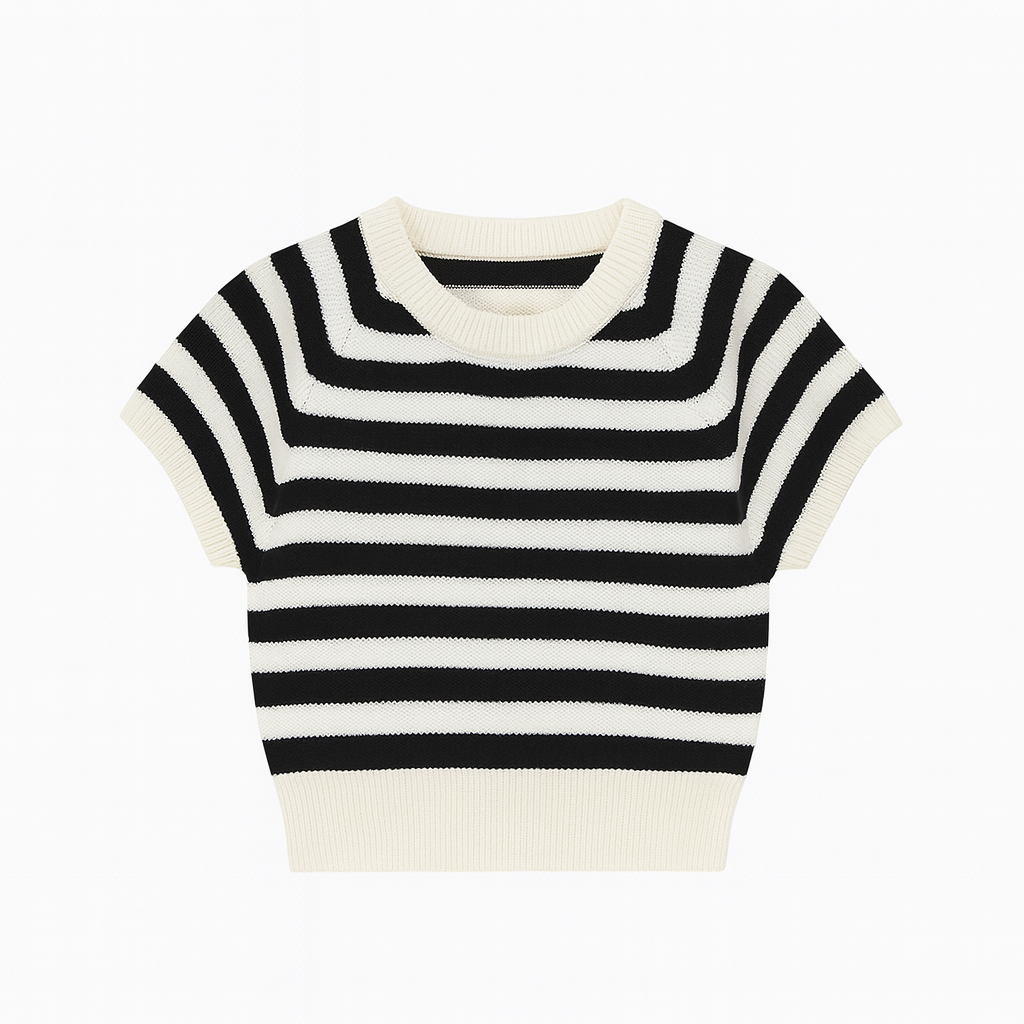 [082]GM MEIYANG [In Stock] Berry Knit Top Ice Silk Look Striped Patchwork U-neck Short Length Short Sleeve Top