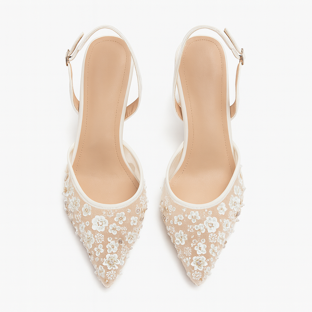 [095]NM Women's 2025 Summer New Arrival White Flower Bridal Stiletto Heels Pointed Toe Mesh Lace High Heels Closed Toes Sandals