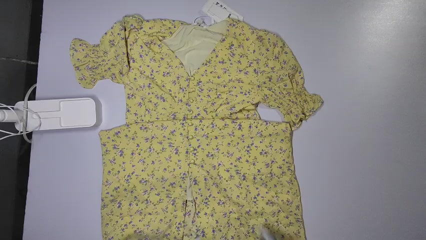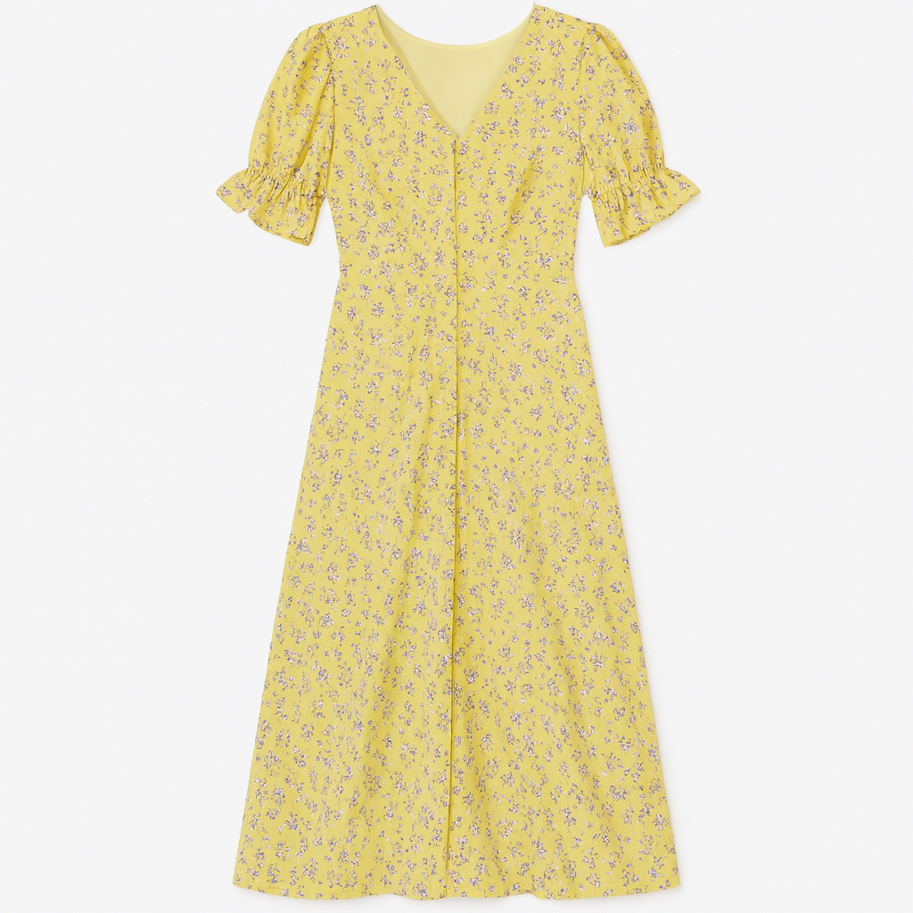 [116]GM French V-neck chiffon yellow floral print dress for women summer puff sleeves waist belt tailored waist elegant slit tea dress