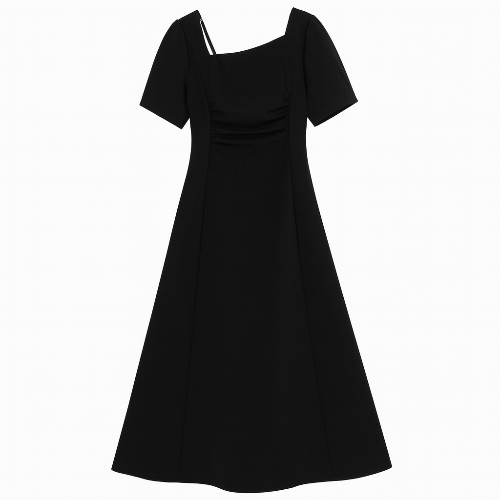 [190]GM Dushu Plus Size Women's Designer Cut-Out Square Neck Pleated Dress 2025 Summer New Arrival Black Mid-Length Dress