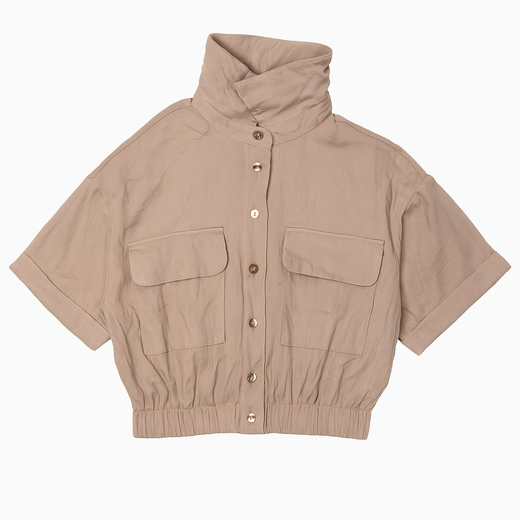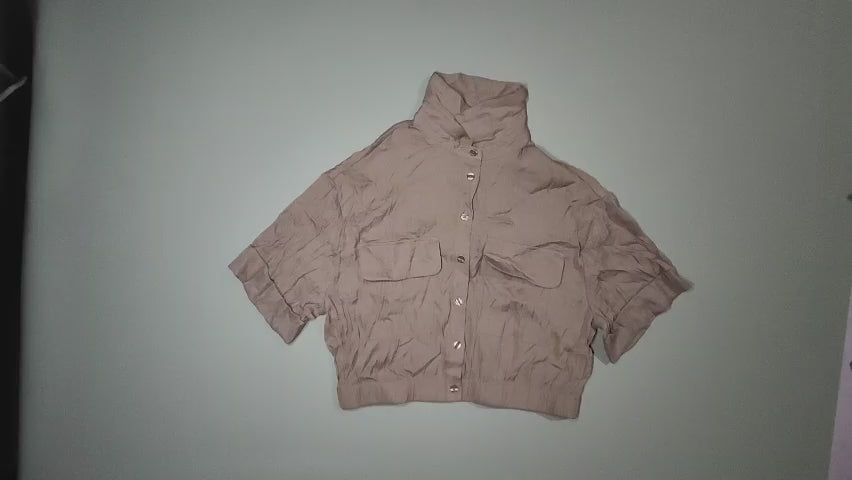 [401]GM Women's Spring and Summer Short Sleeve Stand-Up Collar Shirt with Double Pockets, Loose Casual Fashionable Versatile Top for Foreign Trade in European and American Markets