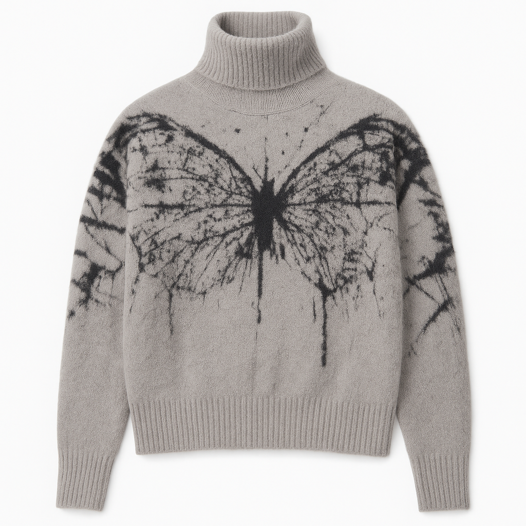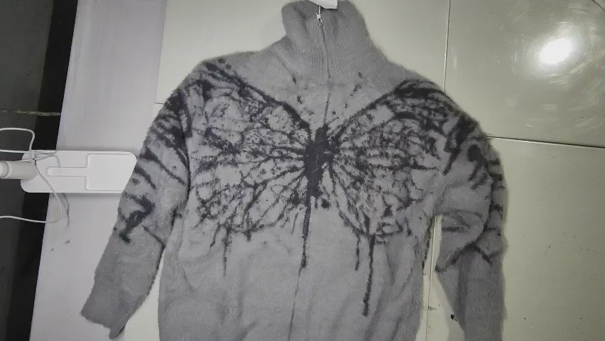 [445]MS American Gray Butterfly Jacquard Turtleneck Mink Velvet Knitted Cardigan for Women Spring & Fall Design Sweater Jacket Top